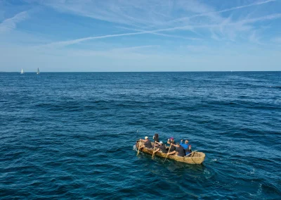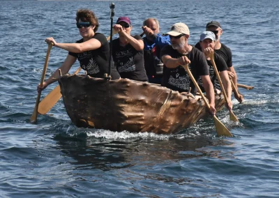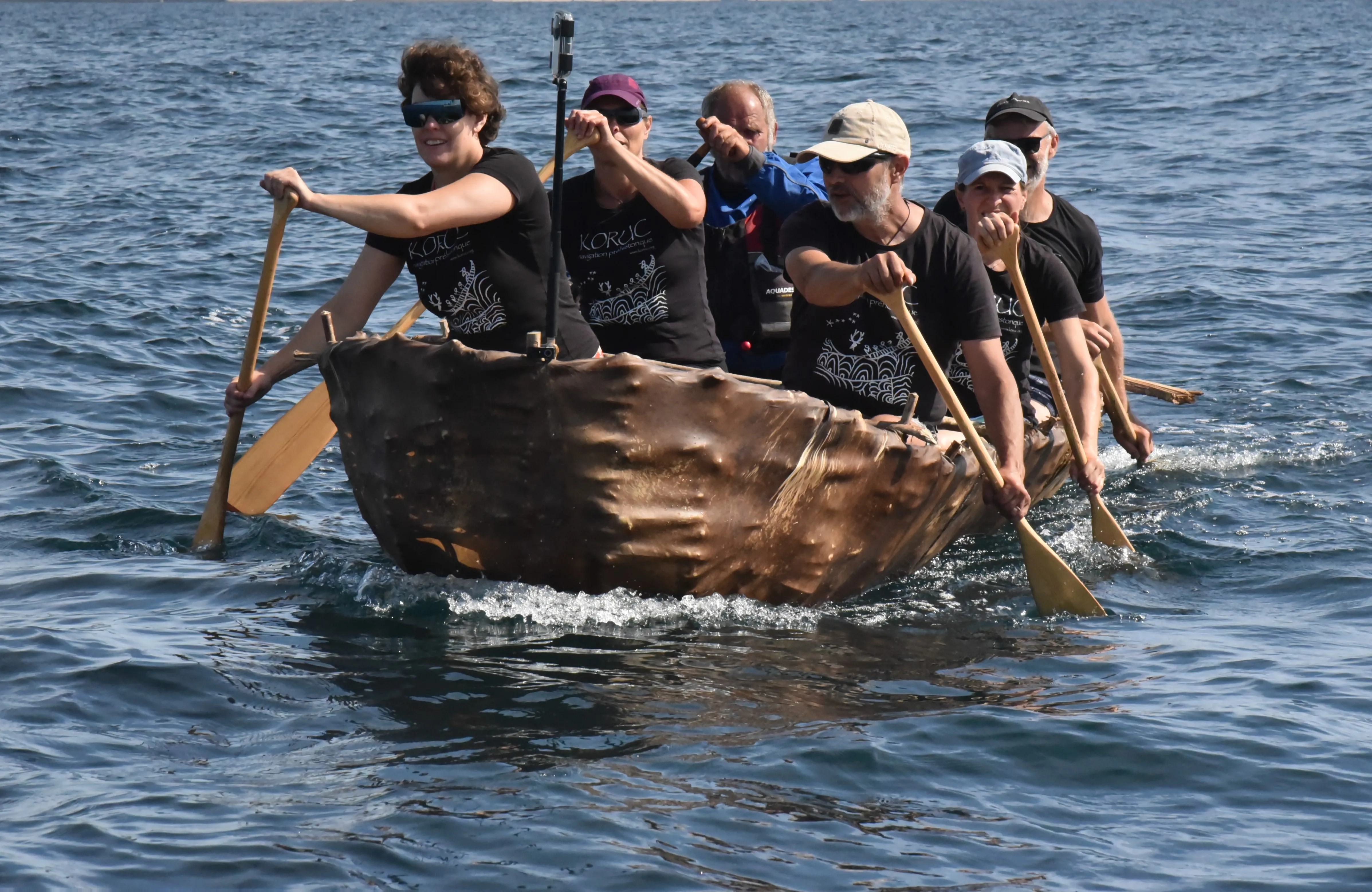 Deux reconstitutions d’embarcations étaient engagées : une pirogue monoxyle en pin sylvestre (8 m x 0,70 m) et un bateau à l’armature de perches de noisetiers tressées recouverte de peaux de bisons cousues (5,50 m x 1,30m). Les deux embarcations, dans des conditions de mer parfaites, n’ont eu aucune difficulté à réaliser la traversée. Rendez-vous l’année prochaine pour tenter une nouvelle navigation !