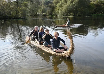Le scirpe s’avère matériau prometteur : facile à travailler, à la fois souple et rigide une fois les matériaux liés ensemble, permettant la construction d’une embarcation profilée, légère et relativement solide.